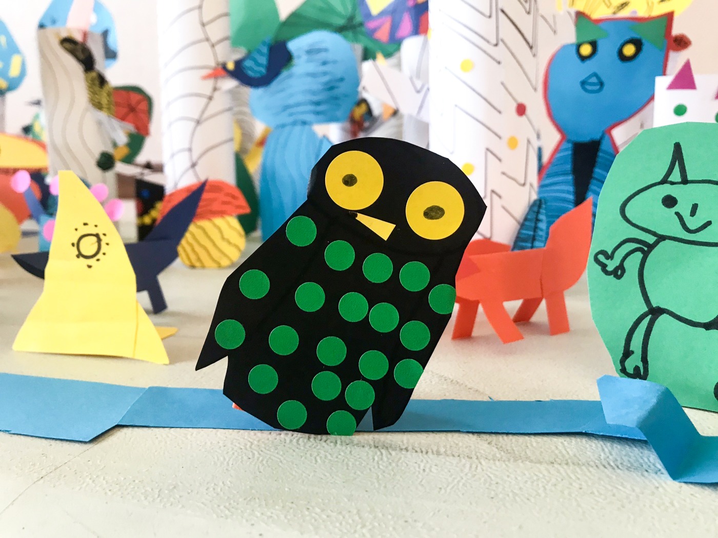 Tels des scénographes, seuls et en équipe, réfléchis, intuitifs et astucieux, les enfants construisent un décor en papier. Des feuilles roulées, découpées, scotchées, coloriées, collées... deviennent des troncs, de l'écorce, des feuillages, des arbres, des buissons, des rochers, une rivière, une cascade, des champignons, un loup, un renard...