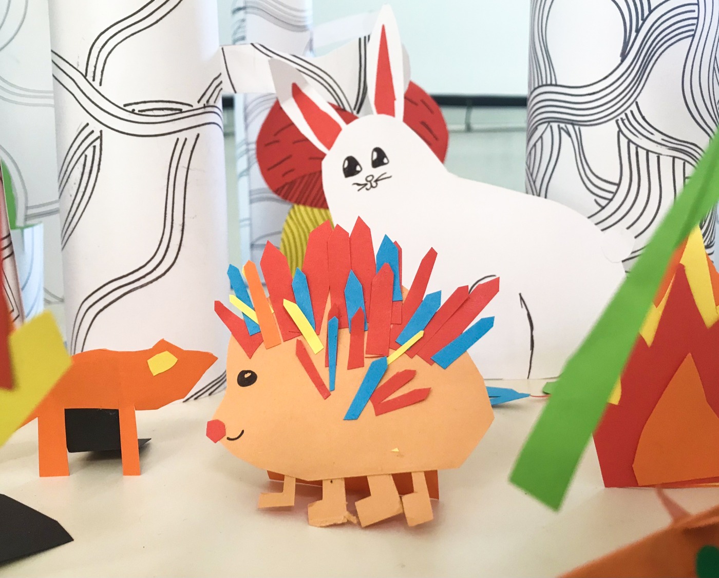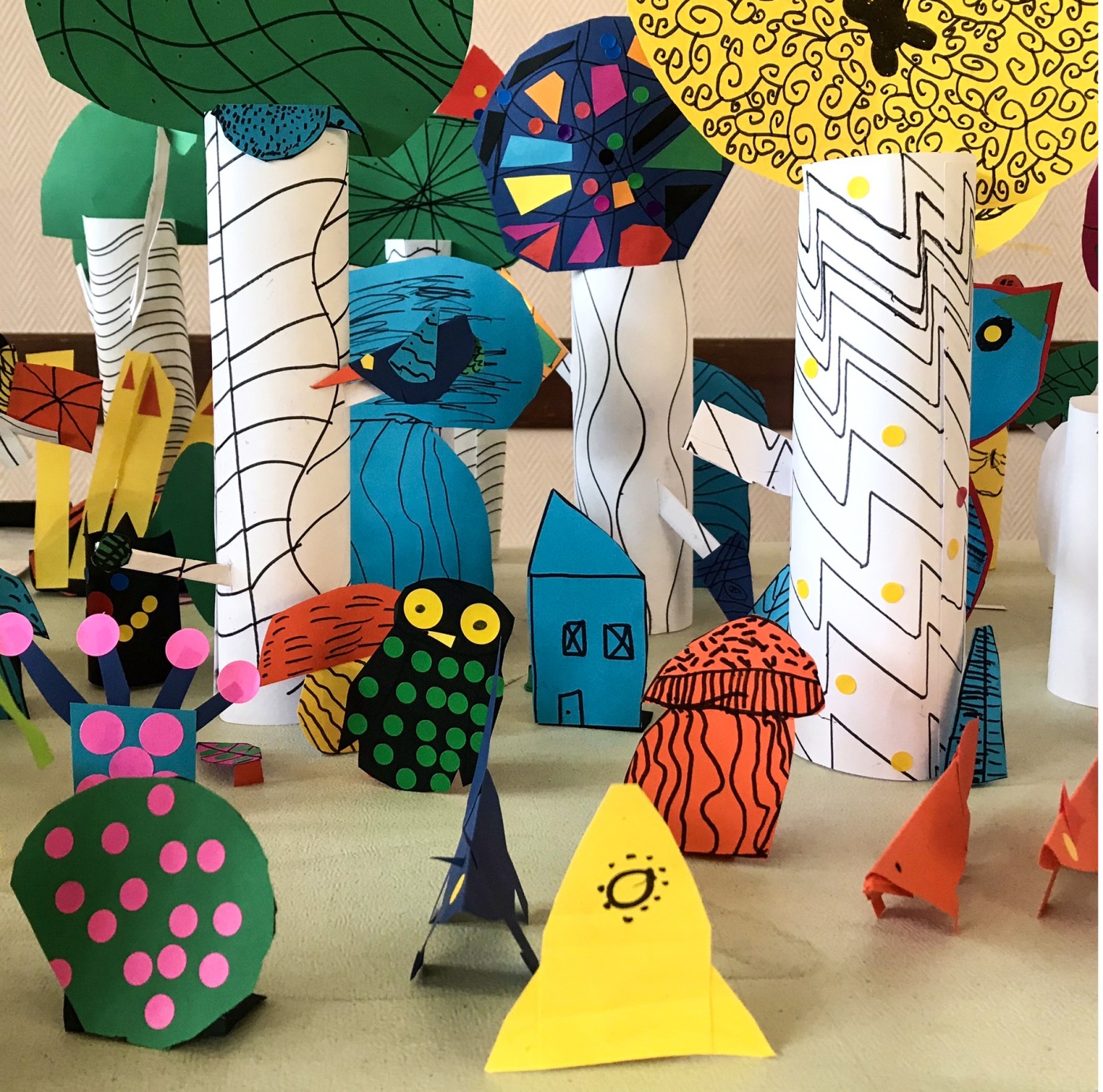 Tels des scénographes, seuls et en équipe, réfléchis, intuitifs et astucieux, les enfants construisent un décor en papier. Des feuilles roulées, découpées, scotchées, coloriées, collées... deviennent des troncs, de l'écorce, des feuillages, des arbres, des buissons, des rochers, une rivière, une cascade, des champignons, un loup, un renard...